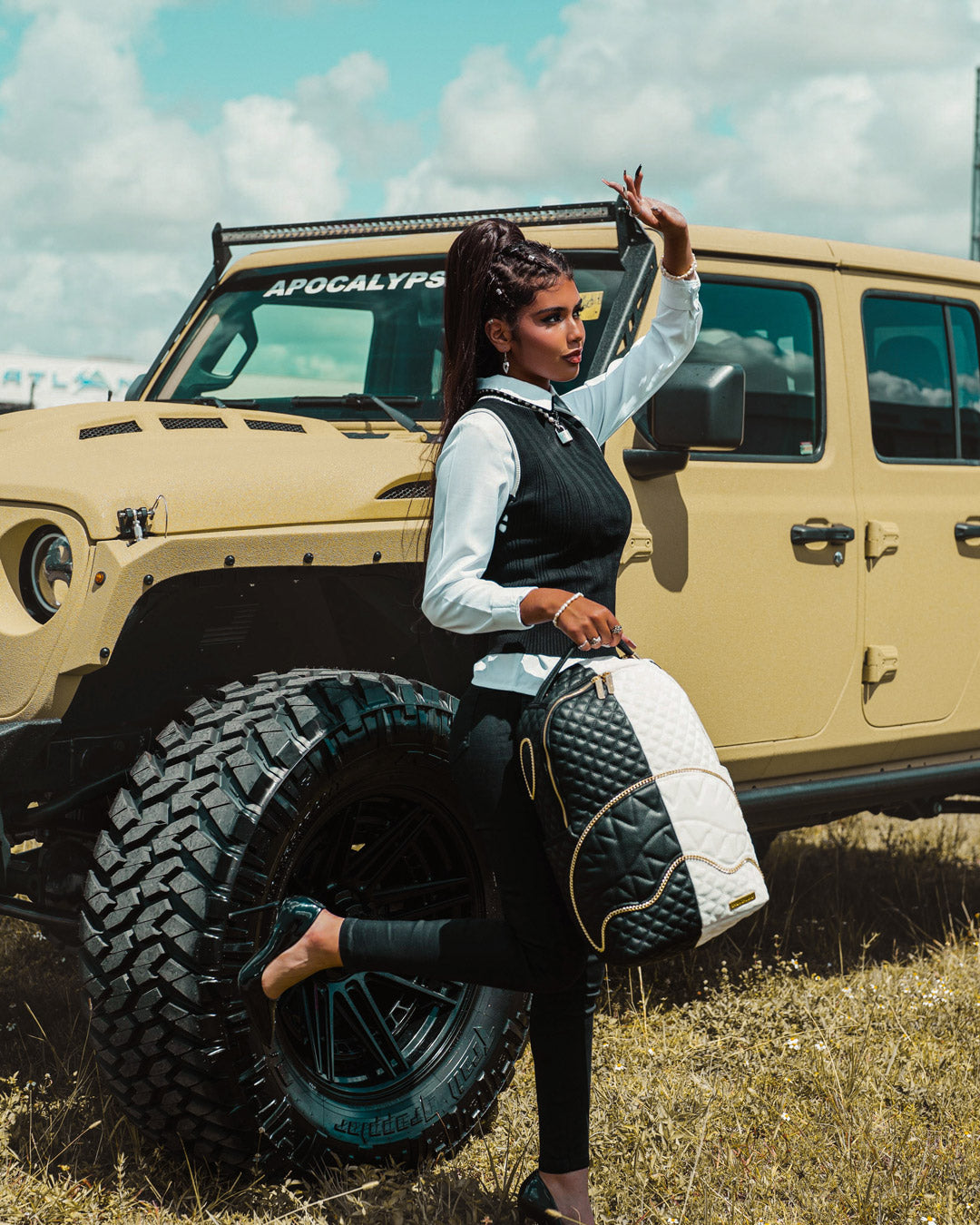 Dimensions: 18″ x 6″ x 11.5″ ? Front zipper pocket ? Side pockets ? Zippered Stash pocket ? Separate velour sunglass compartment ? Ergonomic mesh back padding ? Adjustable Straps for custom sizing ? Gold zippers with metal hardware ? Metal “Sprayground Authentic” badge ? Slide through back sleeve connects to carry-on luggage to free your hands