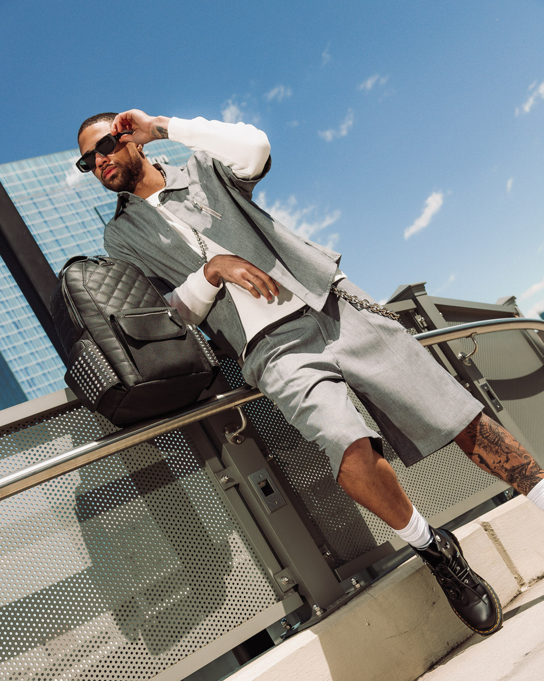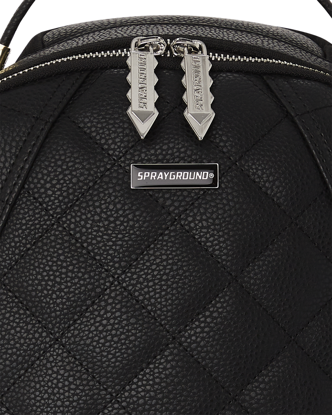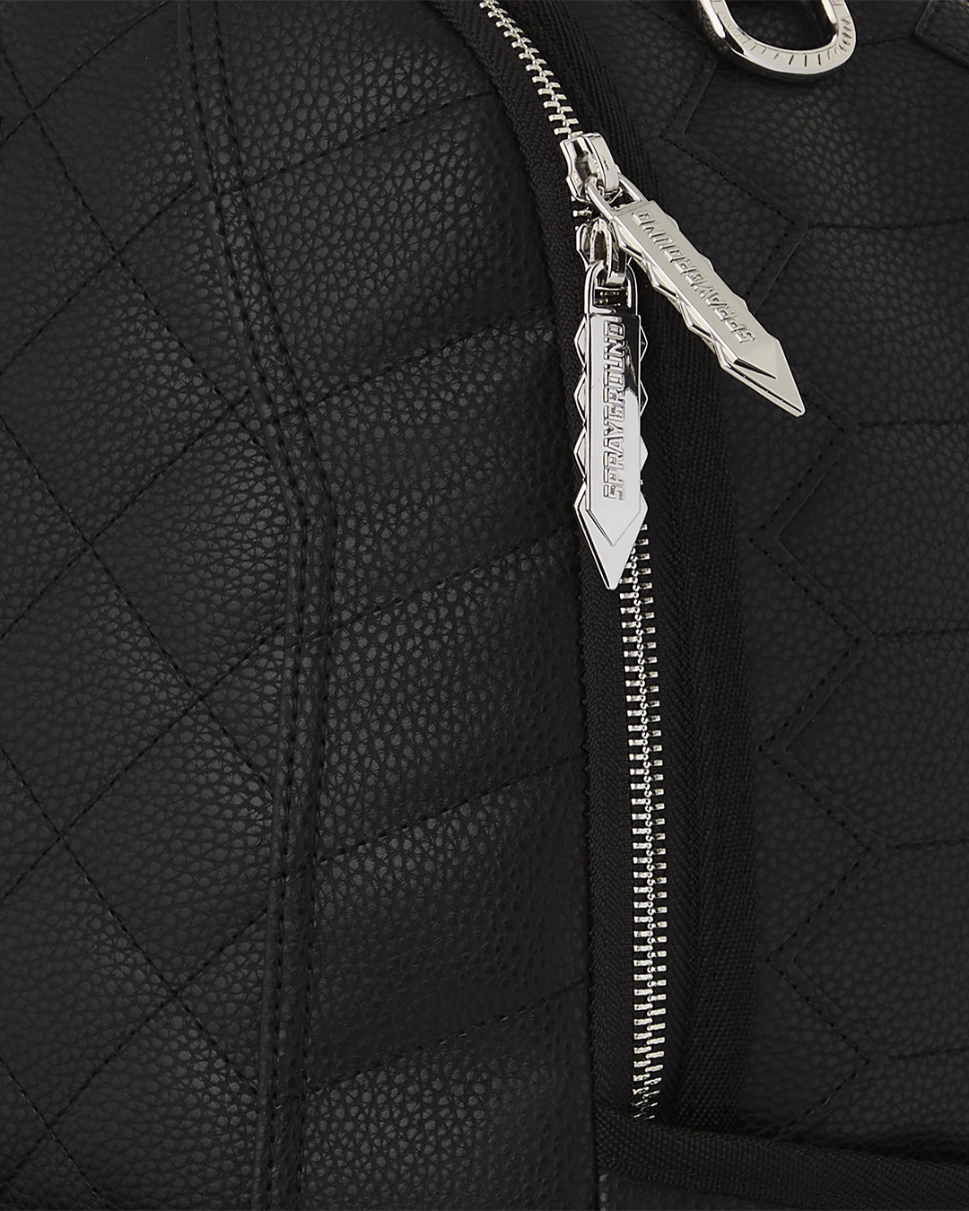Quilted PVC with stud detailing, unique zipper pullers, extra exterior cargo pocket