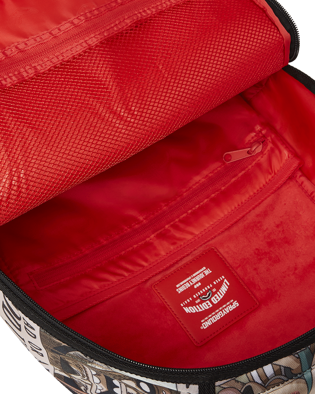 Dimensions: 18″ x 6″ x 11.5″ ? Front zipper pocket ? Side pockets ? Zippered Stash pocket ? Separate velour sunglass compartment ? Ergonomic mesh back padding ? Adjustable Straps for custom sizing ? Gold zippers with metal hardware ? Metal “Sprayground Authentic” badge ? Slide through back sleeve connects to carry-on luggage to free your hands